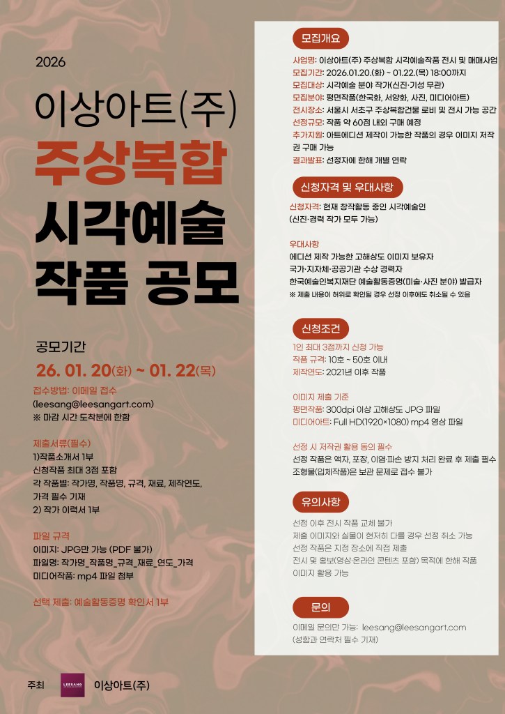이상아트(주)는 2026년 새해를 맞아 서초구 주상복합 건물 내 전시 및 매매를 위한 시각예술작품을 다음과 같이 공모합니다. 역량 있는 시각예술인들의 많은 참여를 바랍니다.