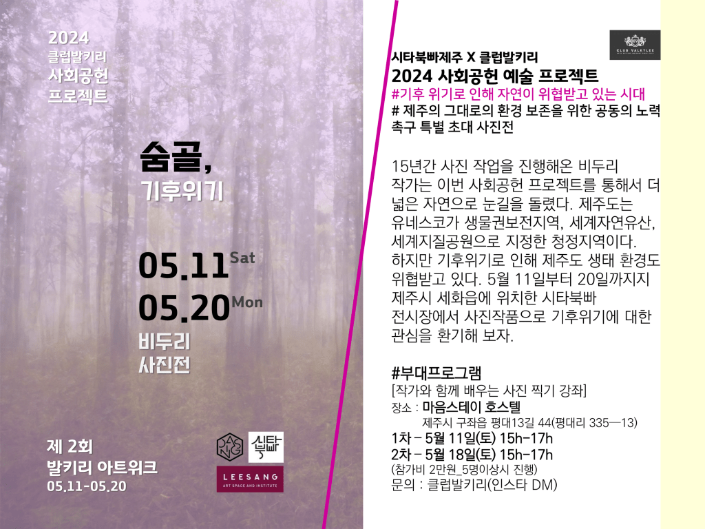 클럽발키리(대표 이상미)가 올해 사회공헌 프로젝트로 전 회원의 역량 강화와 사회 참여 확대, 다양한 협력사업 개발 등에 기여하고자 마련한 비두리 개인전 <숨골, 기후위기>(Sumgol, Climate Crisis)가 제주시 구좌읍 세화리에 있는 시타북빠에서 5월 11일(토)부터 20일(월)까지 개최된다. 이번 전시회는 제2회 발키리 아트위크의 일환이다.